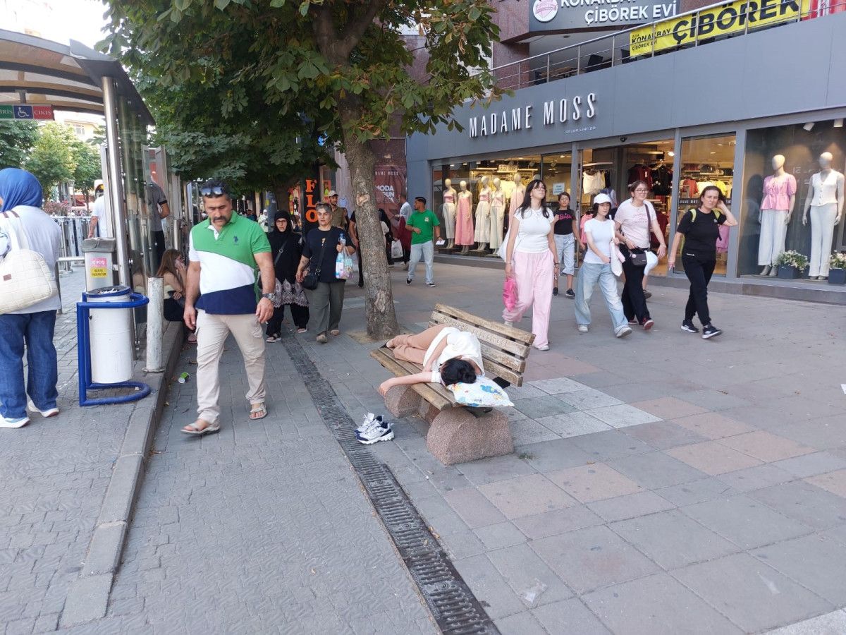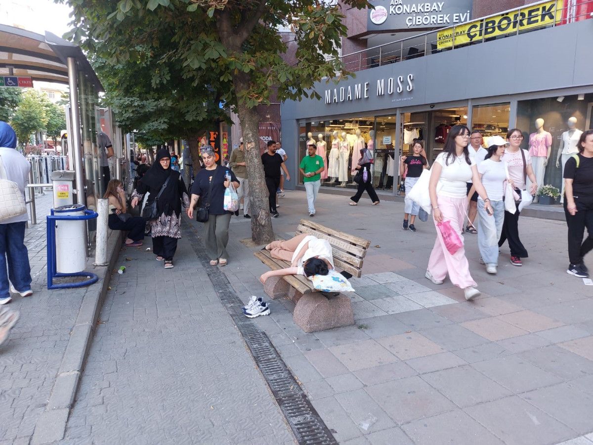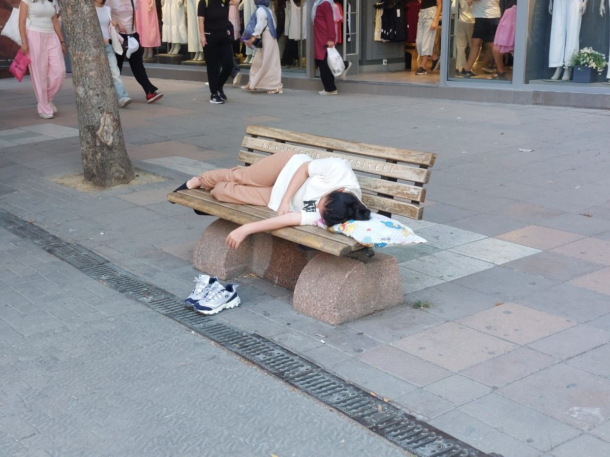 Kent merkezinde cadde üzerindeki tramvay durağının arkasında yer alan gölgelik bankta bir genç, kafasının altına yastık koyarak uzandı ve uyumaya başladı.