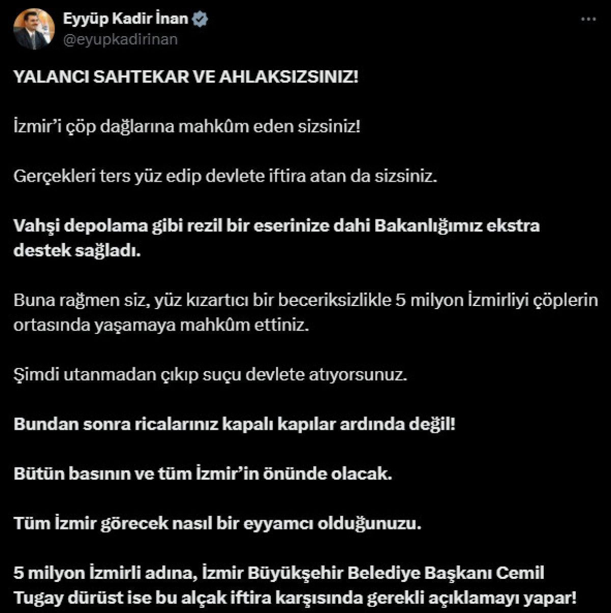Yalancı, sahtekar ve ahlaksızsınız. İzmir’i çöp dağlarına mahkum eden sizsiniz. Gerçekleri ters yüz edip devlete iftira atan da sizsiniz. Vahşi depolama gibi rezil bir eserinize dahi bakanlığımız ekstra destek sağladı. Buna rağmen siz, yüz kızartıcı bir beceriksizlikle 5 milyon İzmirliyi çöplerin ortasında yaşamaya mahkum ettiniz. Şimdi utanmadan çıkıp suçu devlete atıyorsunuz. Bundan sonra ricalarınız kapalı kapılar ardında değil, bütün basının ve tüm İzmir’in önünde olacak. Tüm İzmir görecek nasıl bir eyyamcı olduğunuzu. 5 milyon İzmirli adına, İzmir Büyükşehir Belediye Başkanı Cemil Tugay dürüst ise bu alçak iftira karşısında gerekli açıklamayı yapar.