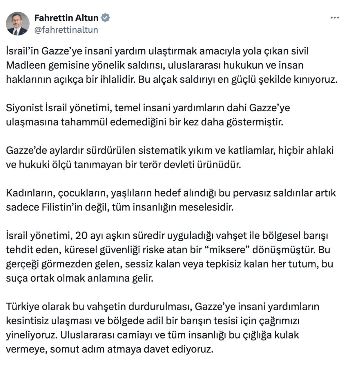 Cumhurbaşkanlığı İletişim Başkanı Fahrettin Altun, İsrail’in Gazze’ye insani yardım ulaştırmak için yola çıkan ve 12 insan hakları savunucusu aktivistin bulunduğu Madleen gemisine saldırısına tepki gösterdi.