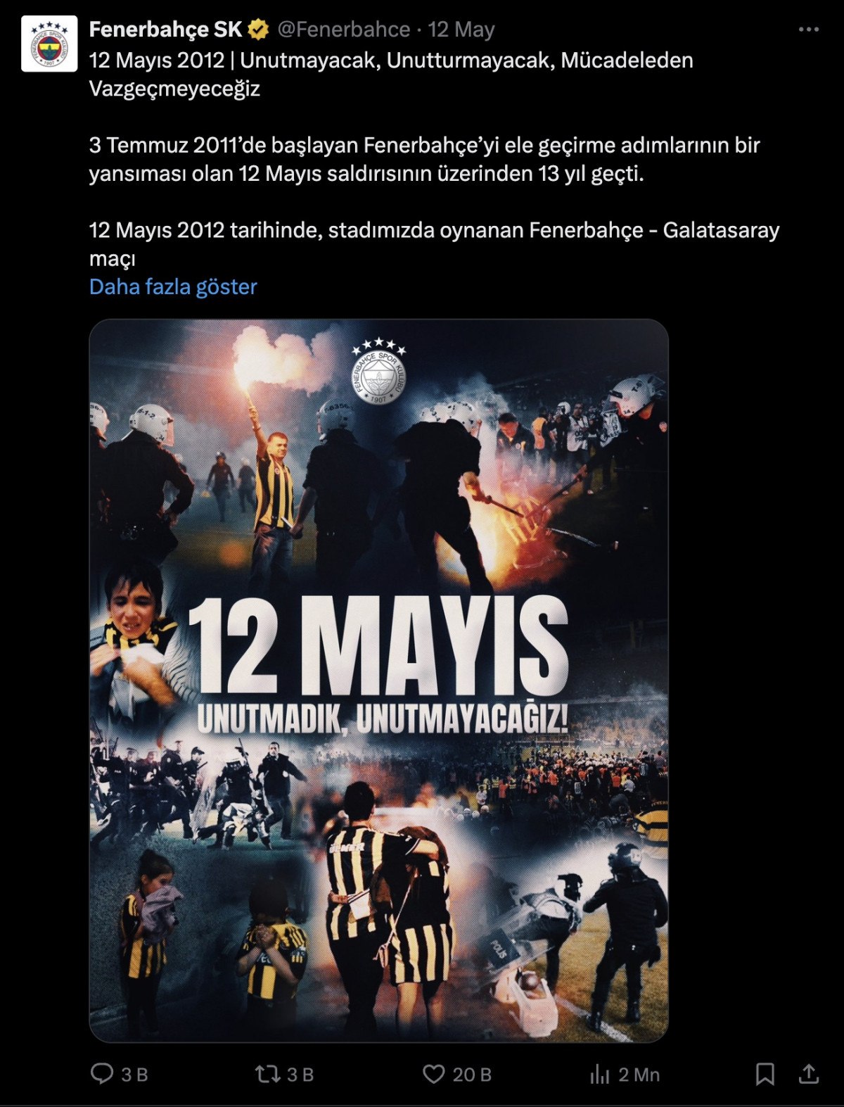 12 Mayıs’ın yıl dönümünde Fenerbahçe kulübü de dikkat çeken bir açıklama yayımladı. 2012’deki maç günü yaşanan olayların “planlı bir saldırı” olduğunu öne süren açıklamada, 3 Temmuz 2011 süreciyle bağlantı kurularak, “varlığımıza kast edenlerle mücadeleden vazgeçmeyeceğiz” ifadelerine yer verildi.