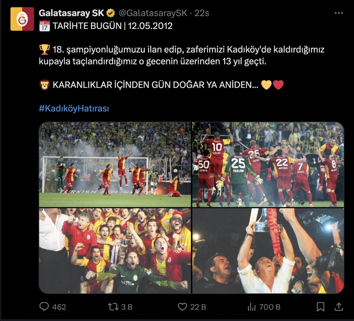 Fenerbahçe’nin açıklamasına Galatasaray kulübü de sosyal medya üzerinden yanıt verdi. 12 Mayıs 2012 gecesini hatırlatan paylaşımda, “Tarihte Bugün | 12.05.2012. 18. şampiyonluğumuzu ilan ettiğimiz gecenin üzerinden 13 yıl geçti” ifadeleri yer aldı. Paylaşım, “Karanlıklardan gündoğar ya aniden…” notuyla sonlandırıldı.