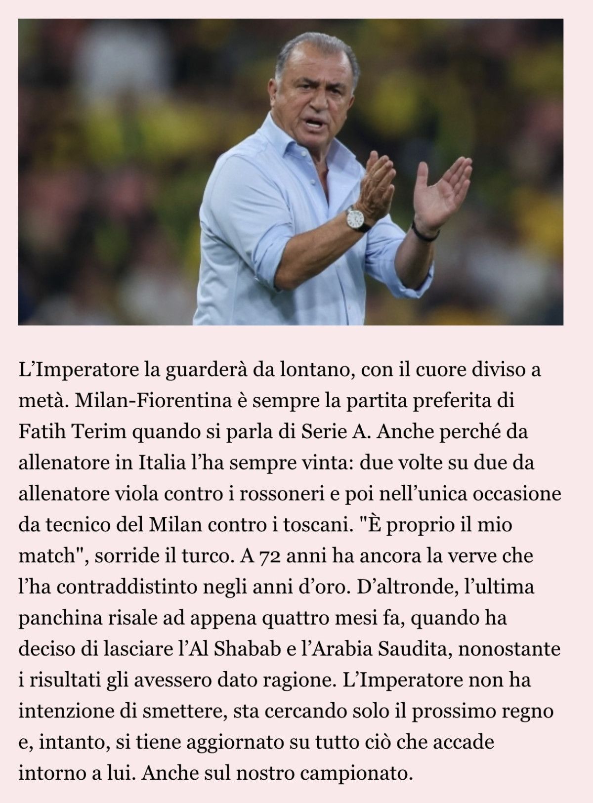 Kariyerinde bir dönem Milan ve Fiorentina’yı çalıştıran ünlü teknik direktör Fatih Terim, İtalyan basınına açıklamalarda bulundu.