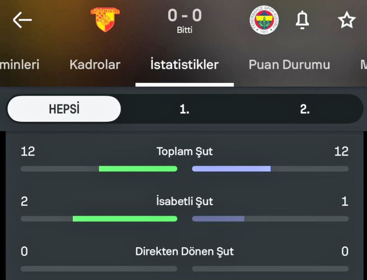 0-0 berabere biten maçta sarı-lacivertliler, sadece bir isabetli şut bulabildi.