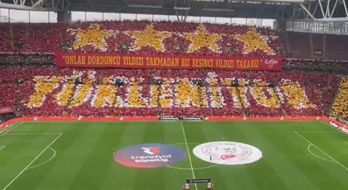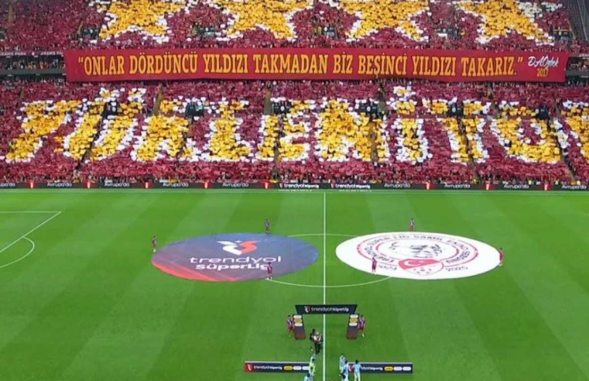Doğu tribününde de sarı-kırmızı kartonlarla ‘İlk ve tek’ yazısı ile ‘5 yıldız’ yapılırken ayrıca Galatasaray Başkanı Dursun Özbek’in 2017 yılında söylediği ‘Onlar dördüncü yıldızı takmadan biz beşinci yıldızı takarız’ sözünün pankartı açıldı.