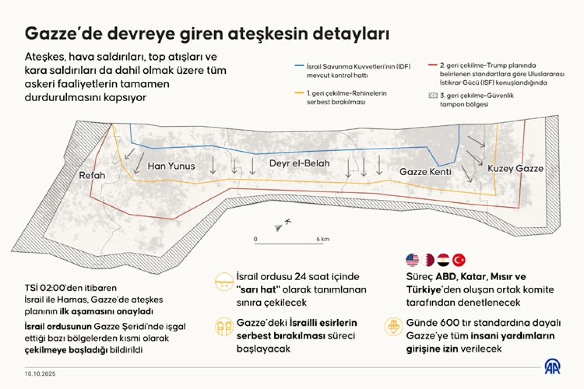 Gazze’de ateşkesin kısmi çekilme tamamlandıktan sonra resmi olarak yürürlüğe gireceği aktarılan haberde, İsrailli esirlerin de 13 Ekim Pazartesi günü serbest bırakılmasının beklendiği ifade edildi.