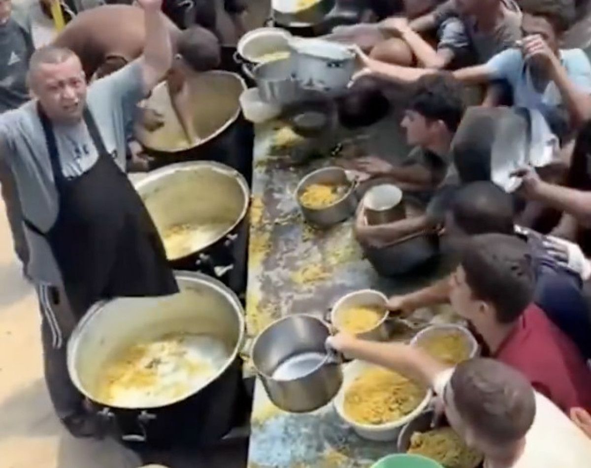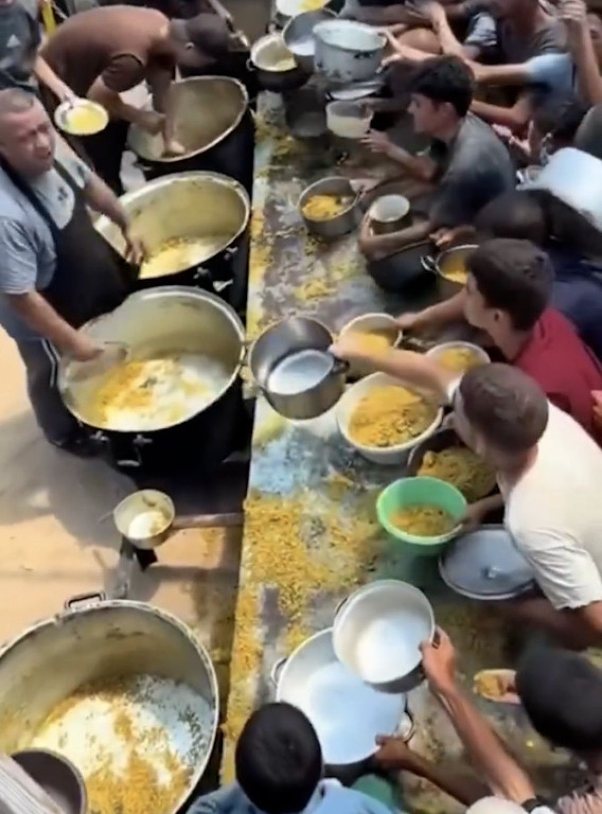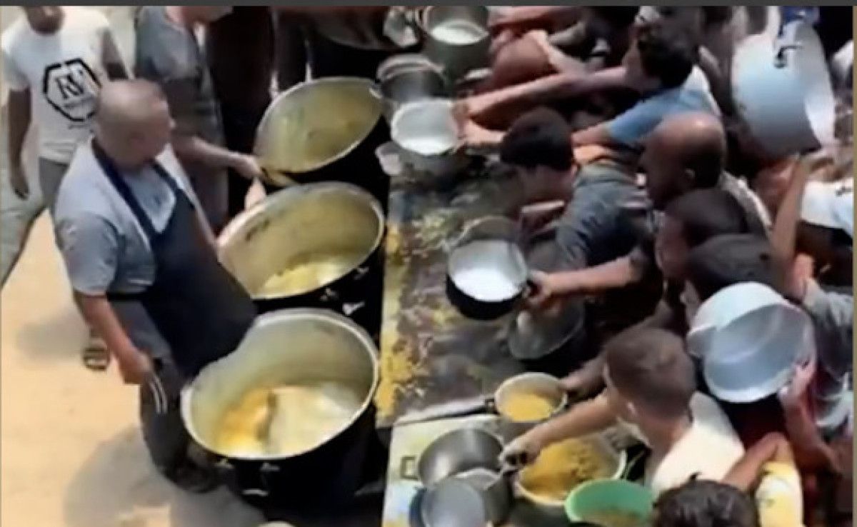 Bölgede yemek dağıtımı sırasında soykırıma uğrayan onlarca çocuk bir kap yemek için sıra bekledi.