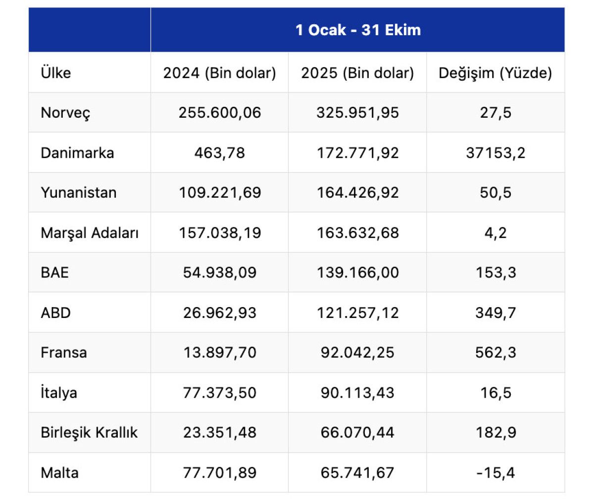 TİM verilerine göre, bu yıl ve 2024 yılının ocak-ekim döneminde gemi yat ve hizmetleri sektörünün en fazla ihracat (bin dolar) yaptığı ülkeler şöyle: