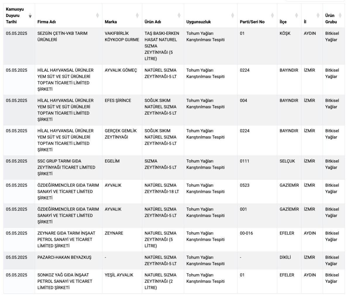 Aydın’ın Efeler ilçesinde faaliyet gösteren Seçil Yağ Gıda Tarım İnşaat Petrol Ürünleri Nakliye İhracat Sanayi ve Ticaret Limited Şirketi’ne ait Seçtat markalı 4,6 litrelik yemeklik karışım yağda, gıdalarda kullanımı yasaklı boya maddesi tespit edildi. Ürünün insan sağlığını tehdit edebilecek nitelikte olduğu belirtildi.