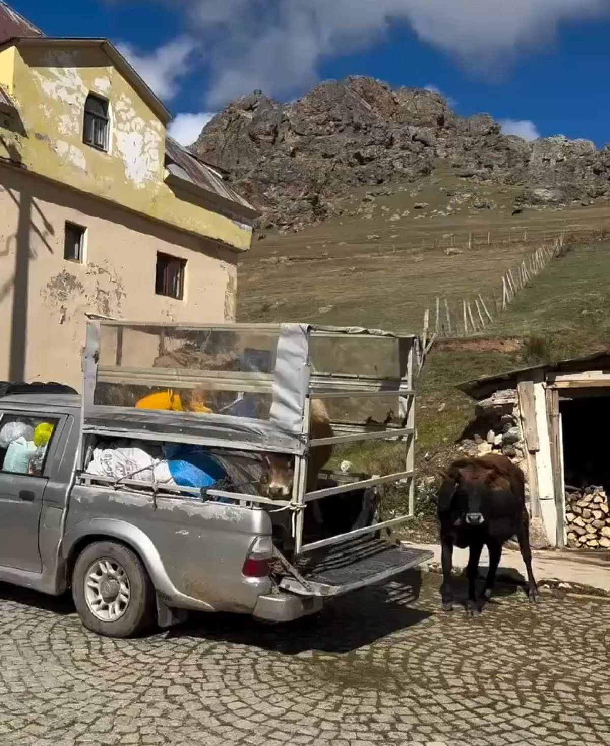 Yayla sezonunun sona ermesiyle ineklerden biri köye götürülmek üzere kamyonete yüklendi.