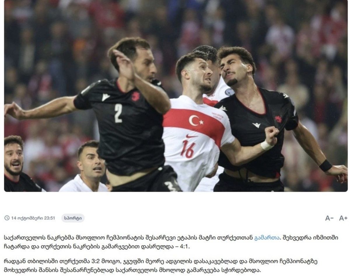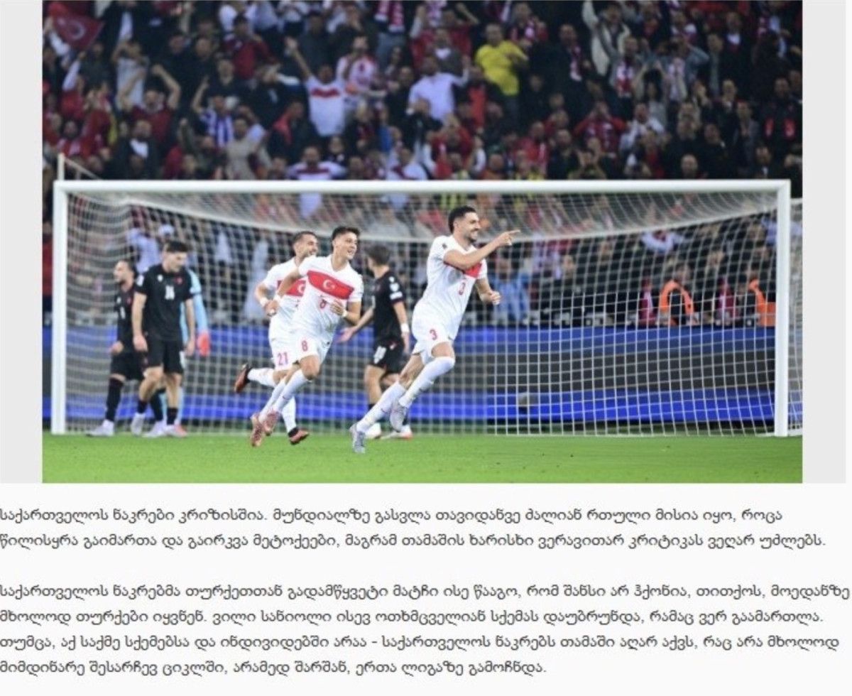 Gürcistan Milli Takımı, Dünya Kupası eleme turunun kritik maçında Türkiye’ye karşı direnemeden mağlup oldu. Günümüz futbolunda en küçük takımlar bile bu kadar çaresizce yenilmiyor. “Final” böyle kaybedilmez! Yeni fikirlere sahip yeni bir koça ihtiyacımız var.