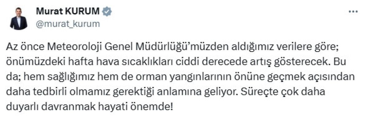 Çevre, Şehircilik ve İklim Değişikliği Bakanı Murat Kurum, sosyal medya hesabından yaptığı paylaşımda, Meteoroloji Genel Müdürlüğünden alınan verilere göre sıcaklıkların gelecek hafta artış göstereceğini belirtti.