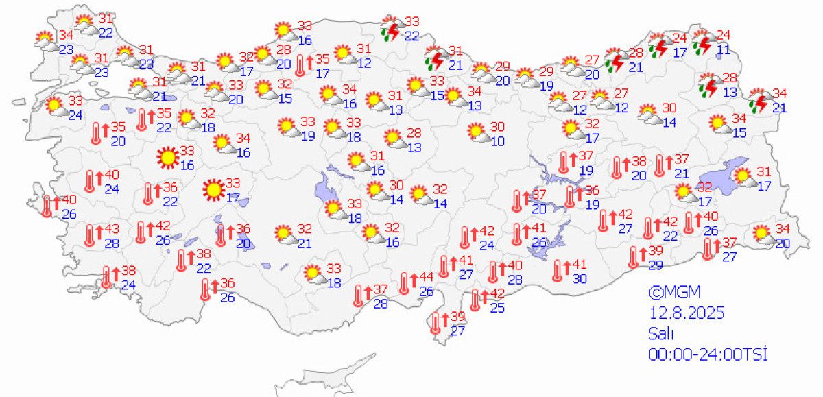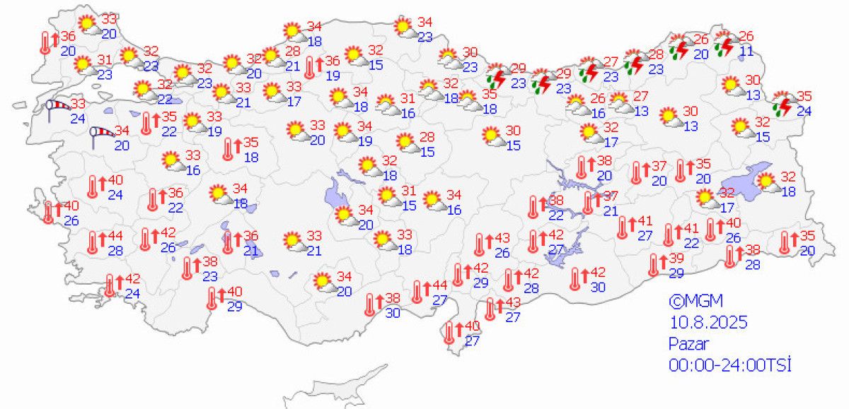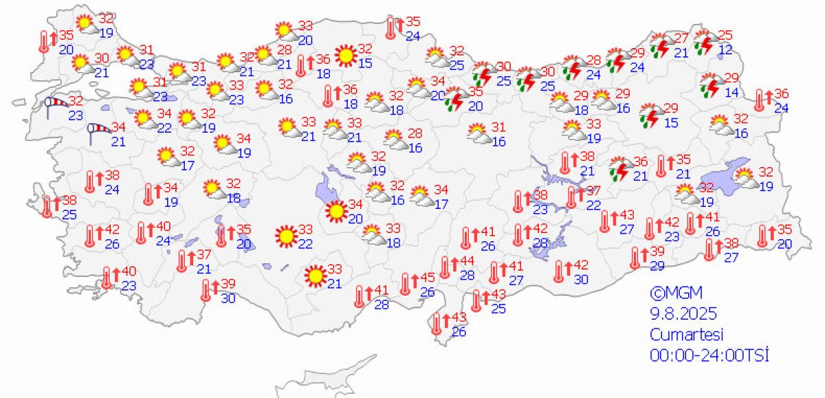 Meteoroloji Genel Müdürlüğü tarafından yapılan tahminlere göre yurdun kuzey, iç ve batı kesimleri parçalı ve yer yer çok bulutlu; Marmara’nın doğusu, İç Ege, Batı Karadeniz’in iç kesimleri, Orta ve Doğu Karadeniz (Amasya ve Çorum hariç) ile Kırklareli ve Tekirdağ’ın doğusu, Sinop, Eskişehir, Çankırı, Ardahan, Kars ve Erzincan çevreleri, Erzurum’un kuzey kesimlerinin yerel sağanak ve gök gürültülü sağanak yağışlı; diğer yerlerin az bulutlu ve açık geçeceği tahmin ediliyor.