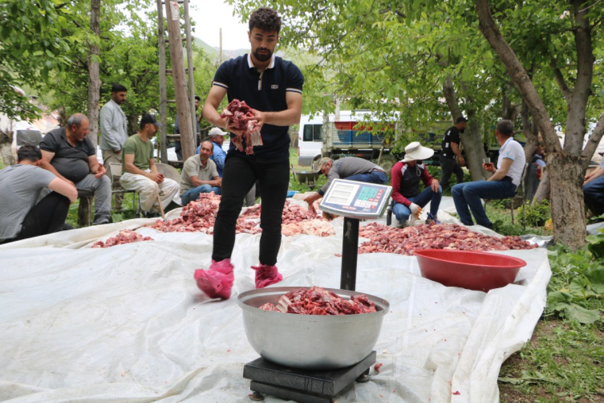 Bayram namazı sonrası, köy meydanına getirilen 100 küçükbaş hayvan kesilip, etleri eşit bir şekilde ayrıştırıldı.