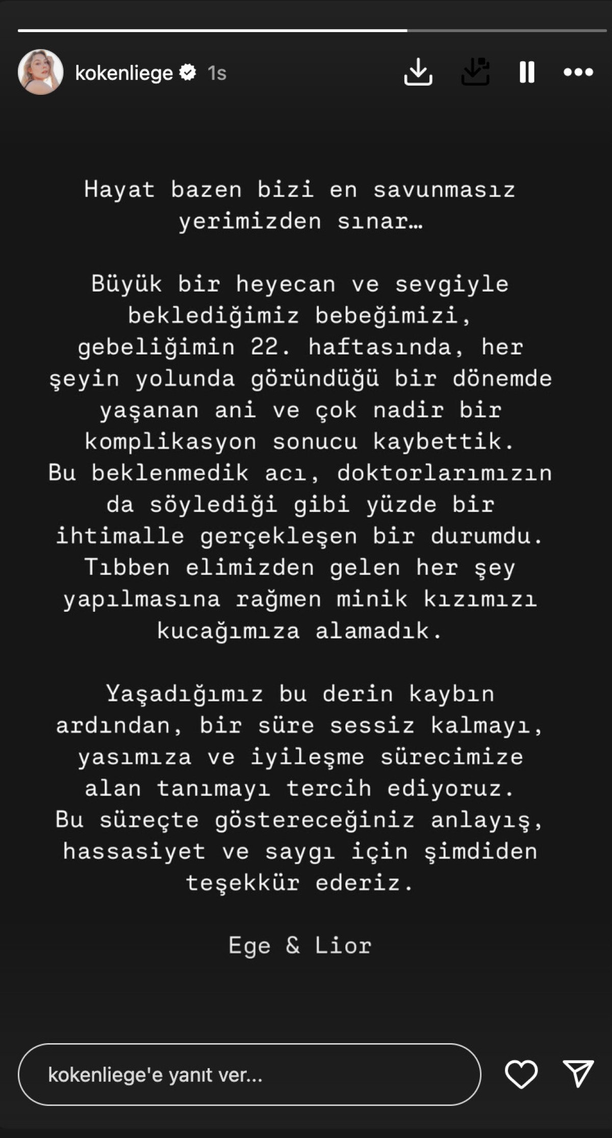 “Hayat bazen bizi en savunmasız yerimizden sınar… Büyük bir heyecan ve sevgiyle beklediğimiz bebeğimizi, gebeliğimin 22.haftasında her şeyin yolunda göründüğü bir dönemde yaşanan ani ve çok nadir bir komplikasyon sonucu kaybettik.