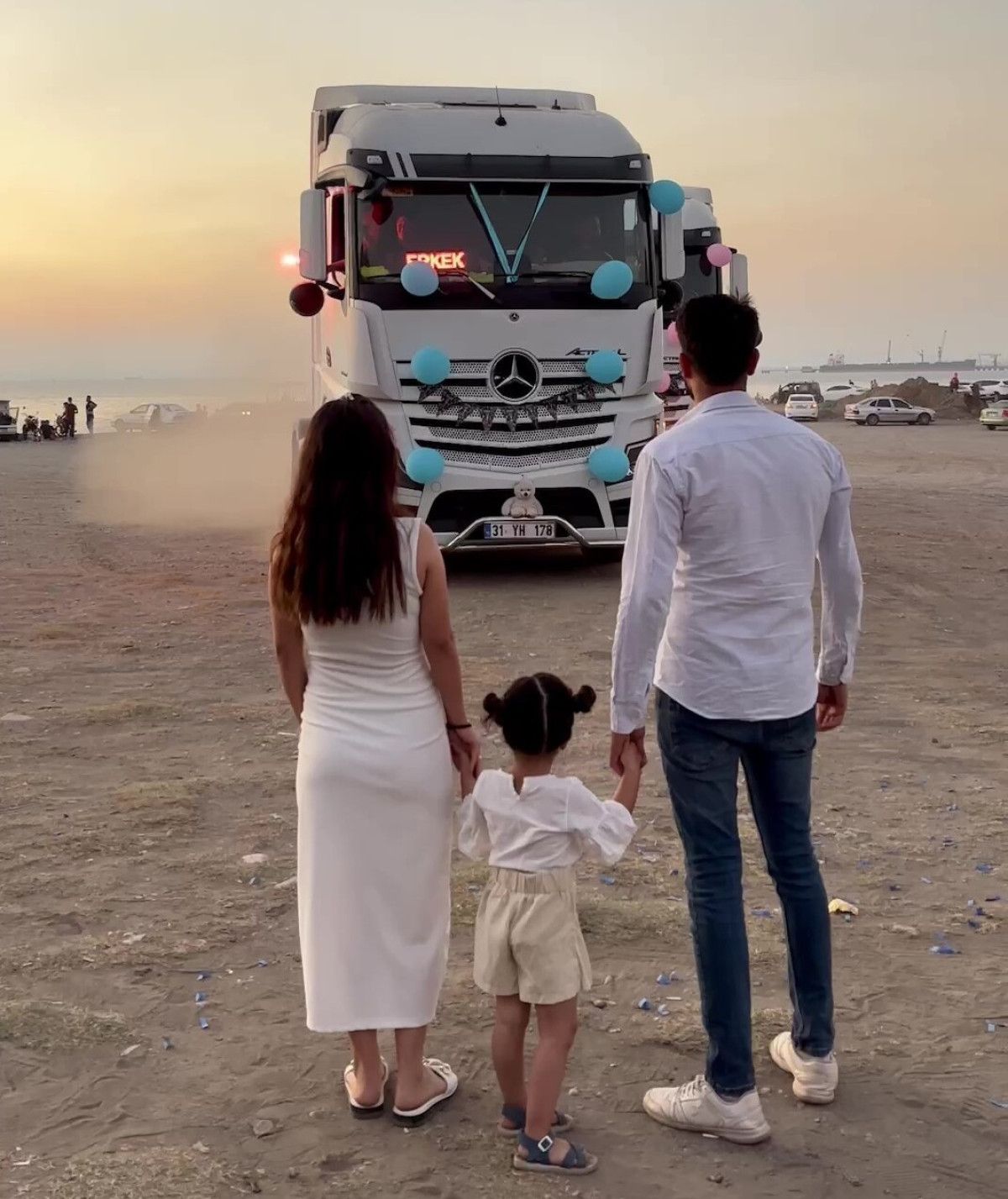 Caner Çevik, meslektaşları ve ailesiyle birlikte hazırladığı organizasyonda, iki tırı süsleyerek birine “erkek”, diğerine “kız” yazdı. Heyecan doruktayken aynı anda hareket eden tırlardan “erkek” yazılı olan tır öne geçip korna çalınca, Çevik çifti bebeklerinin cinsiyetinin erkek olduğunu öğrendi.