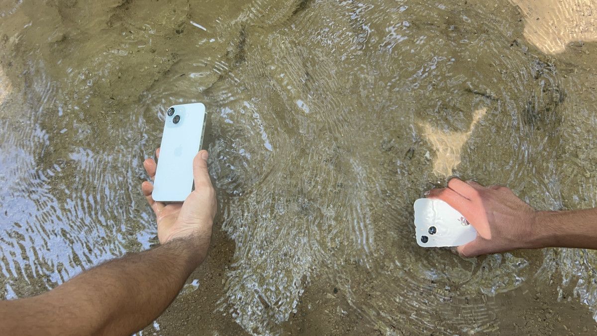 İki arkadaş, telefonlarını akarsuya sokarak serinlettiler ve kullanmaya devam ettiler.