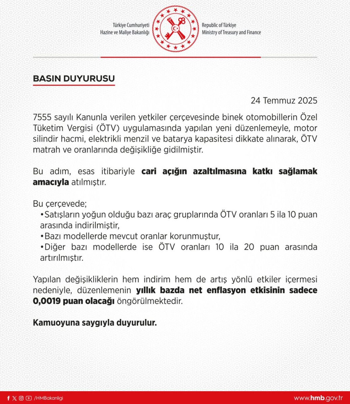 Gelişmeler üzerine Hazine ve Maliye Bakanlığı, 24 Temmuz 2025 tarihli bir basın duyurusu yayımladı.