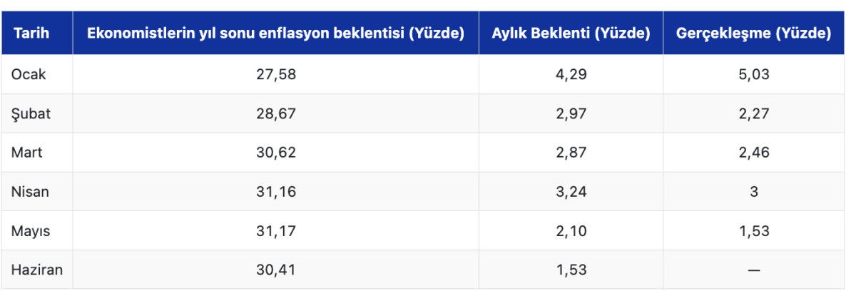 Öte yandan, ekonomistlerin 2025 sonu enflasyon beklentisi haziran ayı itibarıyla yüzde 30,41 oldu.