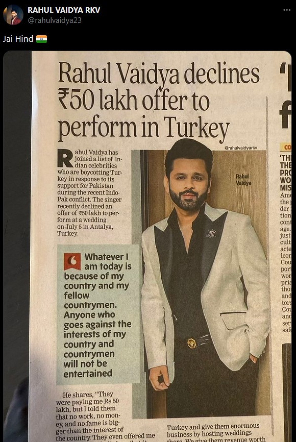 Hindistanlı şarkıcı Rahul Vaidya, Antalya’da bir düğünde sahne alması için kendisine teklif edilen yaklaşık 2,3 milyon TL’lik bir teklifi reddettiğini açıkladı. Vaidya, Türkiye’nin Hindistan Pakistan çatışmasında Pakistan’a açık desteğini eleştirerek, “Ülkeme karşı olanları eğlendirmeyeceğim” ifadelerini kullandı.