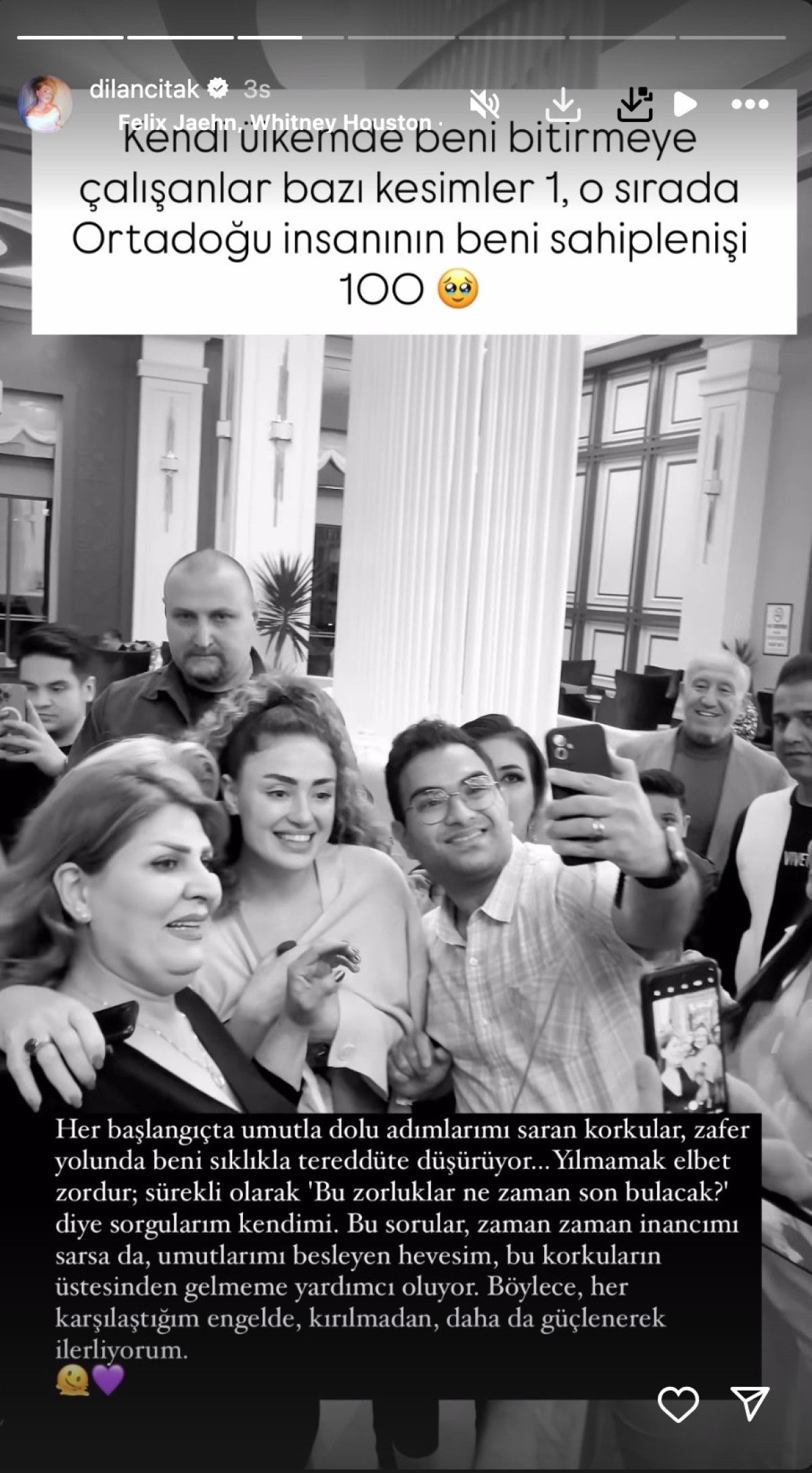 Orta Doğu’da daha çok sevildiğini belirten Çıtak, hayranlarıyla bir arada olduğu videoyu yayınlayarak “Kendi ülkemde beni bitirmeye çalışan bazı kesimler 1, o sırada Orta Doğu insanının beni sahiplenişi 100.” dedi.