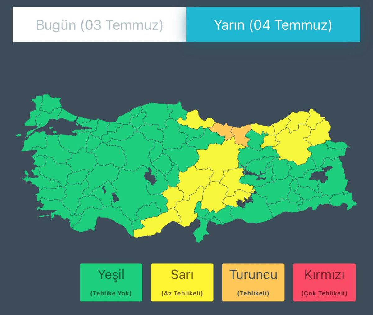 4 Temmuz 2025 Cuma günü öğle saatlerinden itibaren Erzurum, Kars, Ardahan ve Bayburt çevrelerinde yerel olarak kuvvetli sağanak ve gök gürültülü yağışların etkili olacağı tahmin ediliyor.