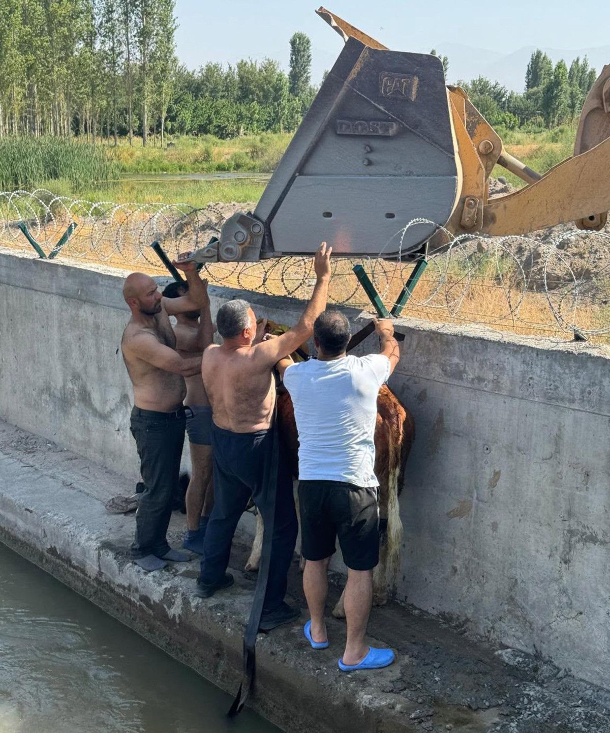 Sulama kanalına giren bölge halkı, danayı halatla bağladı.