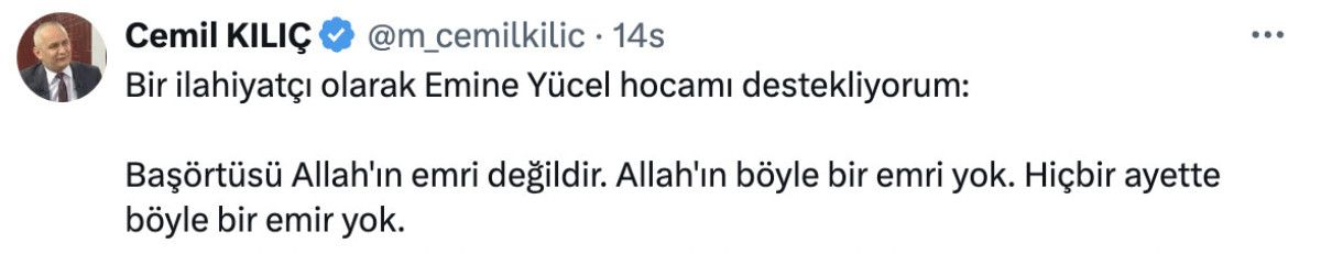 “Bir ilahiyatçı olarak Emine Yücel Hocamı destekliyorum: Başörtüsü Allah’ın emri değildir. Allah’ın böyle bir emri yok. Hiçbir ayette böyle bir emir yok.”