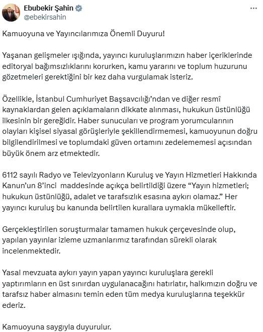 Yaşananların ardından RTÜK Başkanı Ebubekir Şahin’den dikkat çeken bir açıklama geldi. Şahin, basın kurumlarının haber yaparken kamu yararını ve toplum huzurunu gözetmeleri gerektiğini söyledi. Şahin, sosyal medya hesabından yaptığı açıklamada şu ifadeleri kullandı: “Kamuoyuna ve Yayıncılarımıza Önemli Duyuru! Yaşanan gelişmeler ışığında, yayıncı kuruluşlarımızın haber içeriklerinde editoryal bağımsızlıklarını korurken, kamu yararını ve toplum huzurunu gözetmeleri gerektiğini bir kez daha vurgulamak isteriz.
