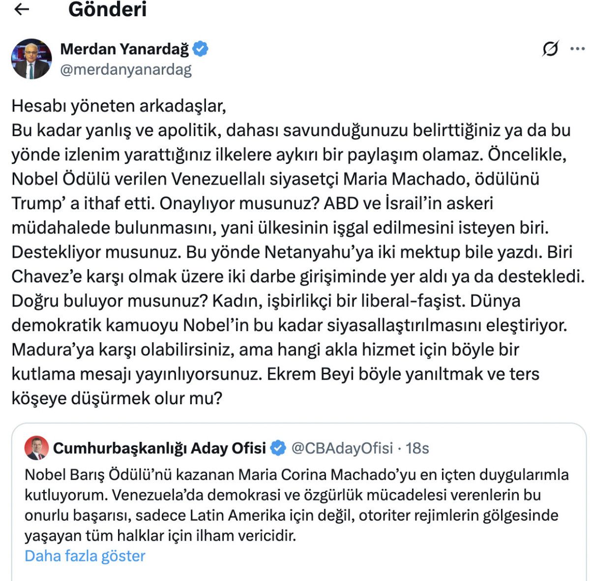 Nobel Ödülü verilen Venezuellalı siyasetçi Maria Machado, ödülünü Trump’ a ithaf etti. Onaylıyor musunuz? ABD ve İsrail’in askeri müdahalede bulunmasını, yani ülkesinin işgal edilmesini isteyen biri. Destekliyor musunuz. Bu yönde Netanyahu’ya iki mektup bile yazdı.