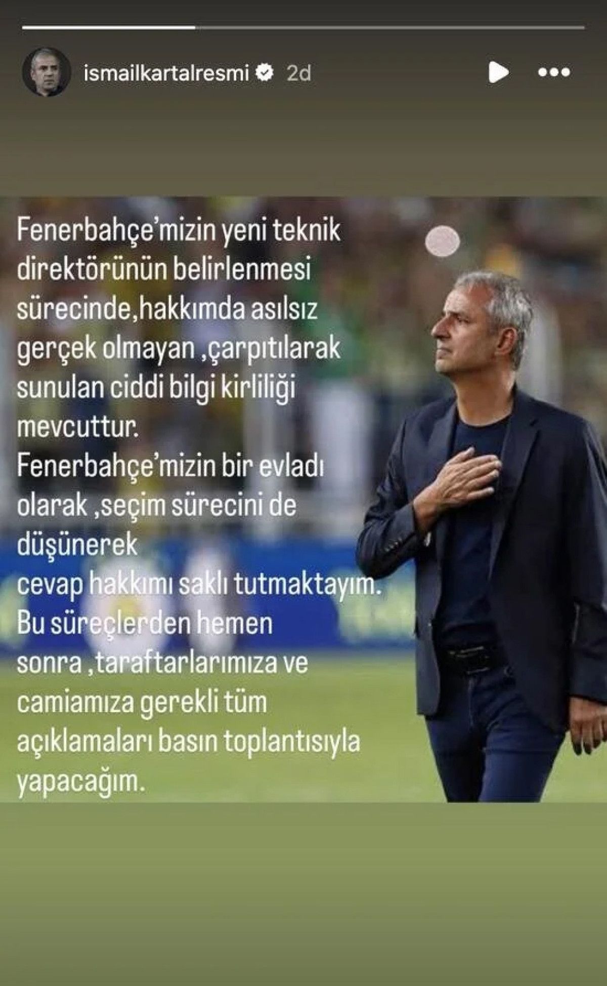 “Fenerbahçe’mizin yeni teknik direktörünün belirlenmesi sürecinde hakkımda asılsız gerçek olmayan, çarpıtılarak sunulan ciddi bilgi kirliliği mevcuttur” diyerek Fenerbahçe’nin bir evladı olduğunu ve seçim sürecini dikkate alarak şu ana kadar sessiz kaldığını söyleyen Kartal, “Cevap hakkımı saklı tuttum. Bu süreçlerden hemen sonra taraftarlarımıza ve camiamıza gerekli tüm açıklamaları basın toplantısıyla yapacağım” ifadeleriyle açıklamasını noktaladı.