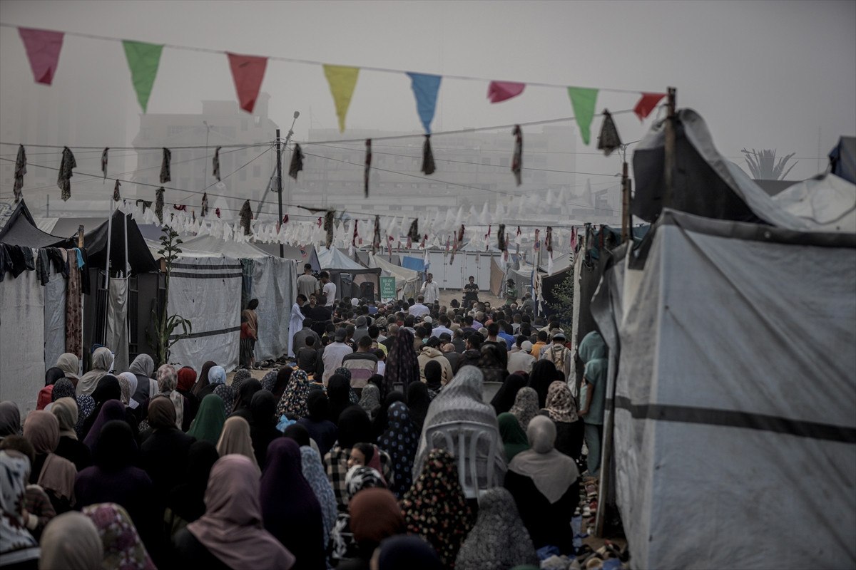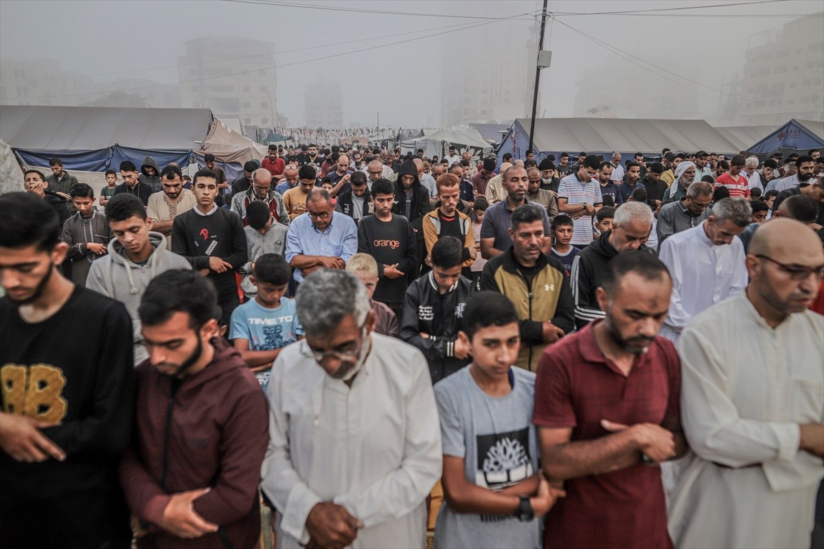 Gazze Şeridi’nde devam eden İsrail saldırılarına rağmen Filistinliler, Kurban Bayramı sabahı namaz için bir araya geldi.