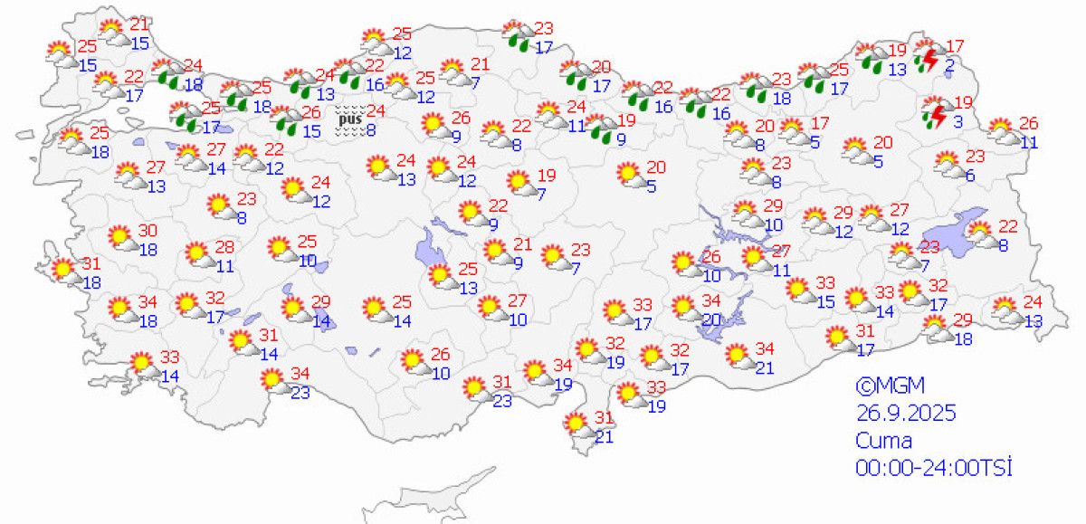 Hava sıcaklıklarının cuma gününden itibaren hissedilir derecede azalarak mevsim normallerinin 4-5 derece altına düşeceği, beklenen en düşük ve en yüksek sıcaklıkların 15-22 derece arasında olacağı tahmin ediliyor.