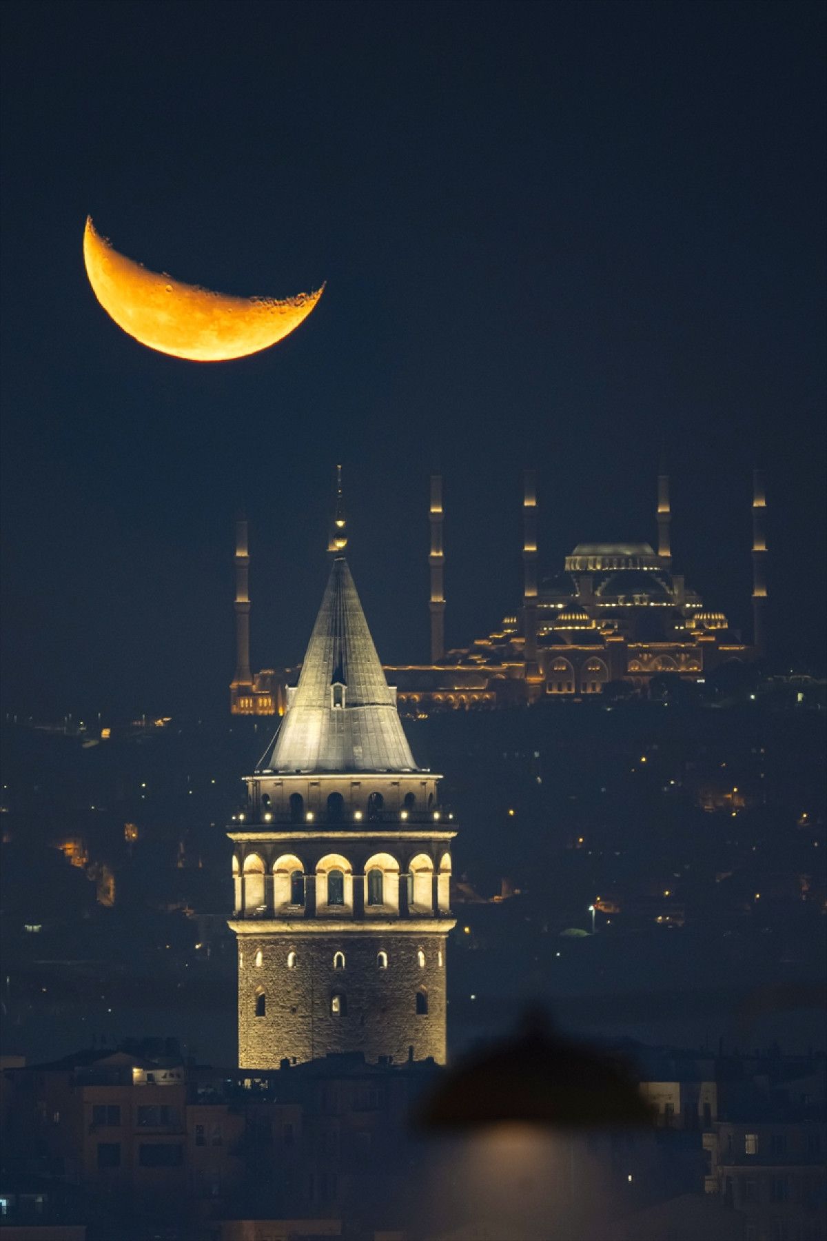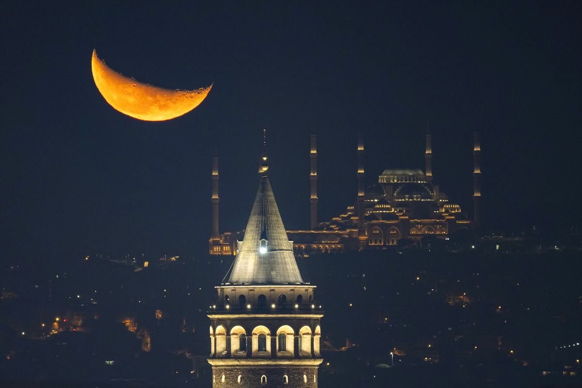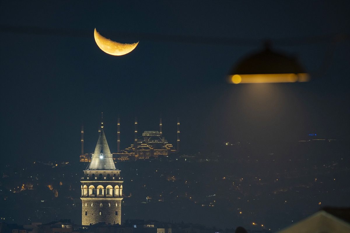 İstanbul’da akşam saatlerinde gökyüzünde beliren hilal, Galata Kulesi ile aynı karede görüntülendi.