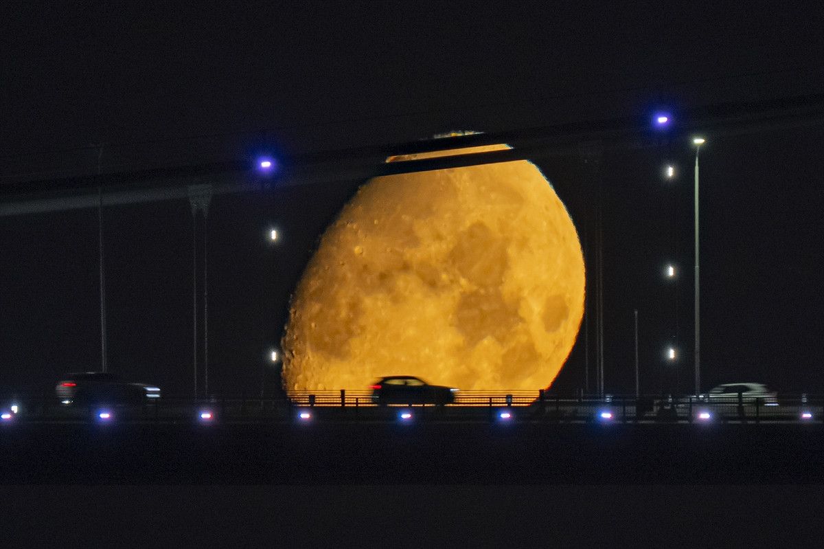 İlk şişkin evresinde (First Quarter) olan ay, Süleymaniye Camisi’nin zarif minareleri önünde yükseldi ve turuncu renk tonlarıyla parlayarak kentin gece manzarasına büyüleyici bir atmosfer kattı.