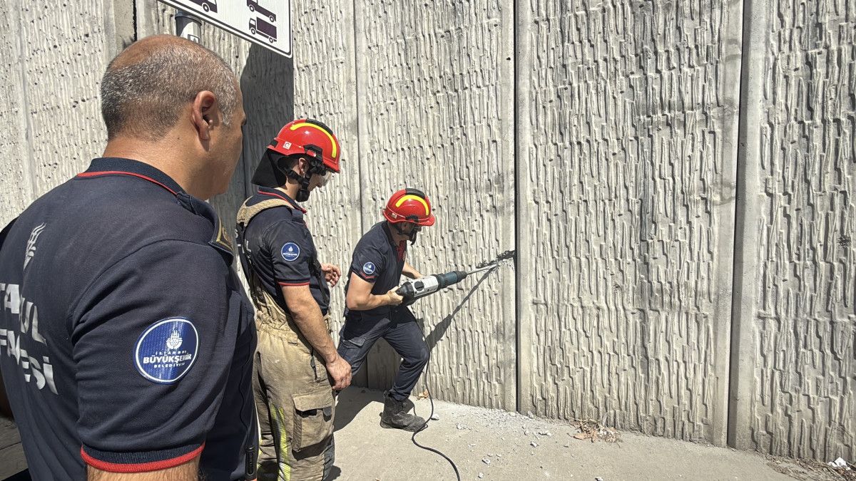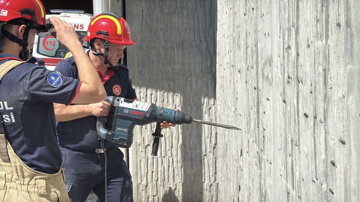 Yaklaşık 15 santimetre kalınlığındaki duvarı bir süre matkapla delen, ardından da beton kesme aletiyle çalışma yapan itfaiye ekibi, demirleri de keserek balyozla duvarı yıktı.