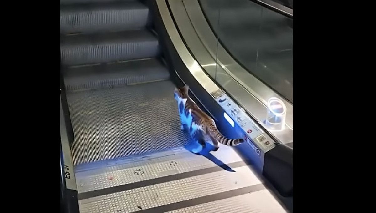 Havalimanında yürüyen merdivene ters yönden binen kedinin yukarı çıkma çabası, cep telefonu kamerasıyla kaydedildi.