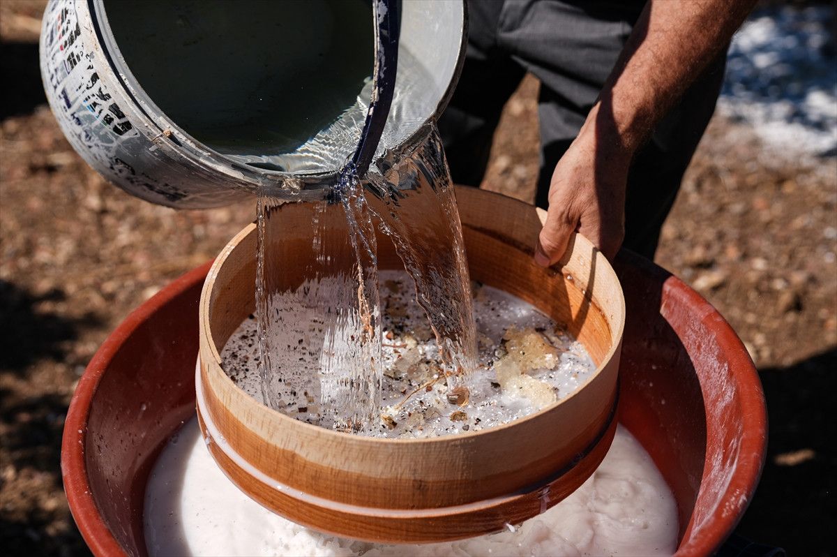 Üreticiler, haziran ayında sakız ağaçlarının altına kireç seriyor. Daha sonra sakız ağacının gövdesine çizik atılarak ağacın öz suyunun kirecin üzerinde birikmesi bekleniyor. Damla damla biriken öz sular kirecin üzerinde kristalize oluyor. Katılaşan öz su, kireçten ayrıştırılıyor.