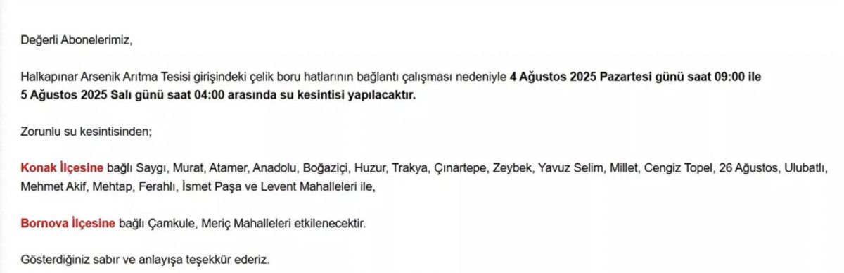 Bornova ve Bayraklı ilçelerinde ise devam eden altyapı yenileme projeleri nedeniyle geçici su kesintileri yaşanıyor.