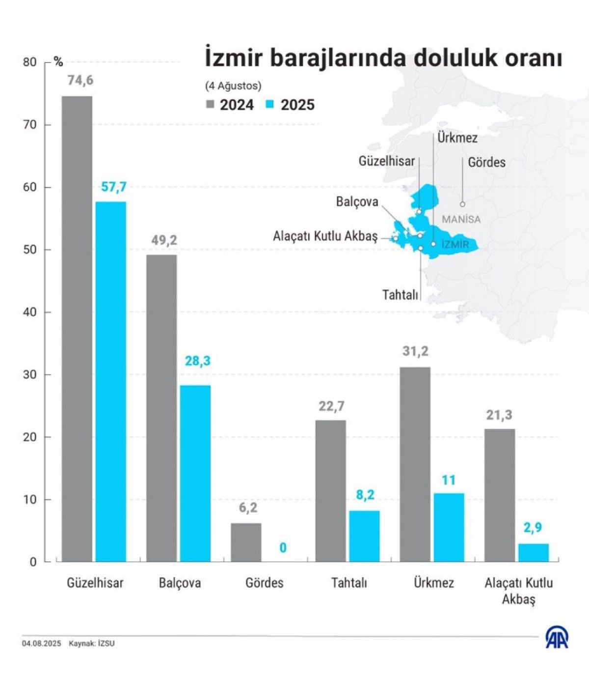 İzmir Su ve Kanalizasyon İdaresi Genel Müdürlüğü (İZSU) verilerine göre, 1 Ağustos 2024’te barajın doluluk oranı yüzde 22,39 iken bu yılın aynı döneminde yüzde 3,13 olarak kaydedildi.