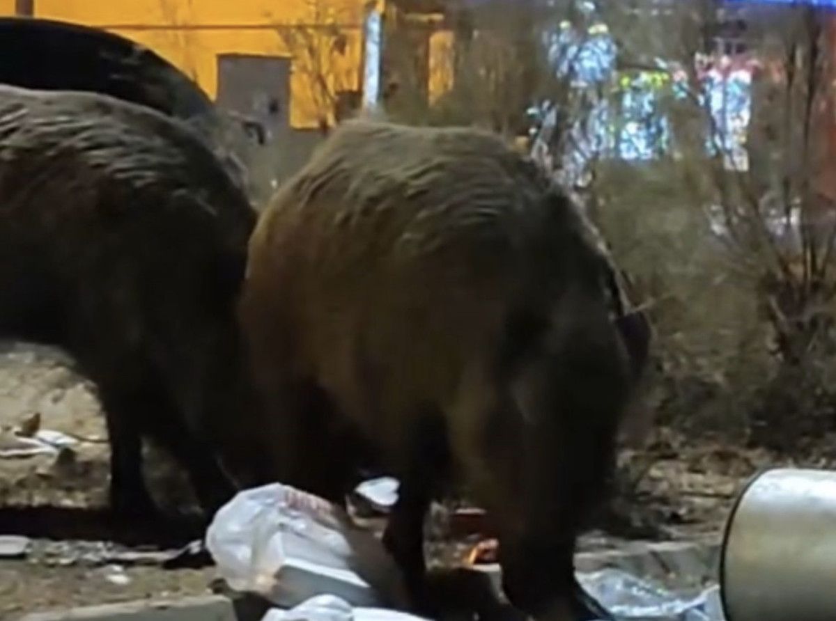 Çöp kutularının olduğu bir noktada zamanında toplanmayan çöpler, domuzların ilgisini çekerken, o anlar bir vatandaş tarafından cep telefonuyla kaydedildi.