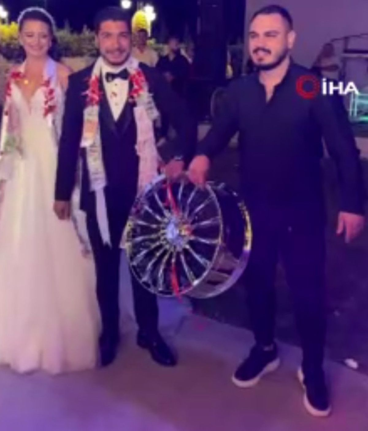 Davetlilerin şaşkınlıkla izlediği Ece, düğün salonuna getirdiği araba jantını gelin ve damadın yanına getirerek takı töreninde hediye etti.