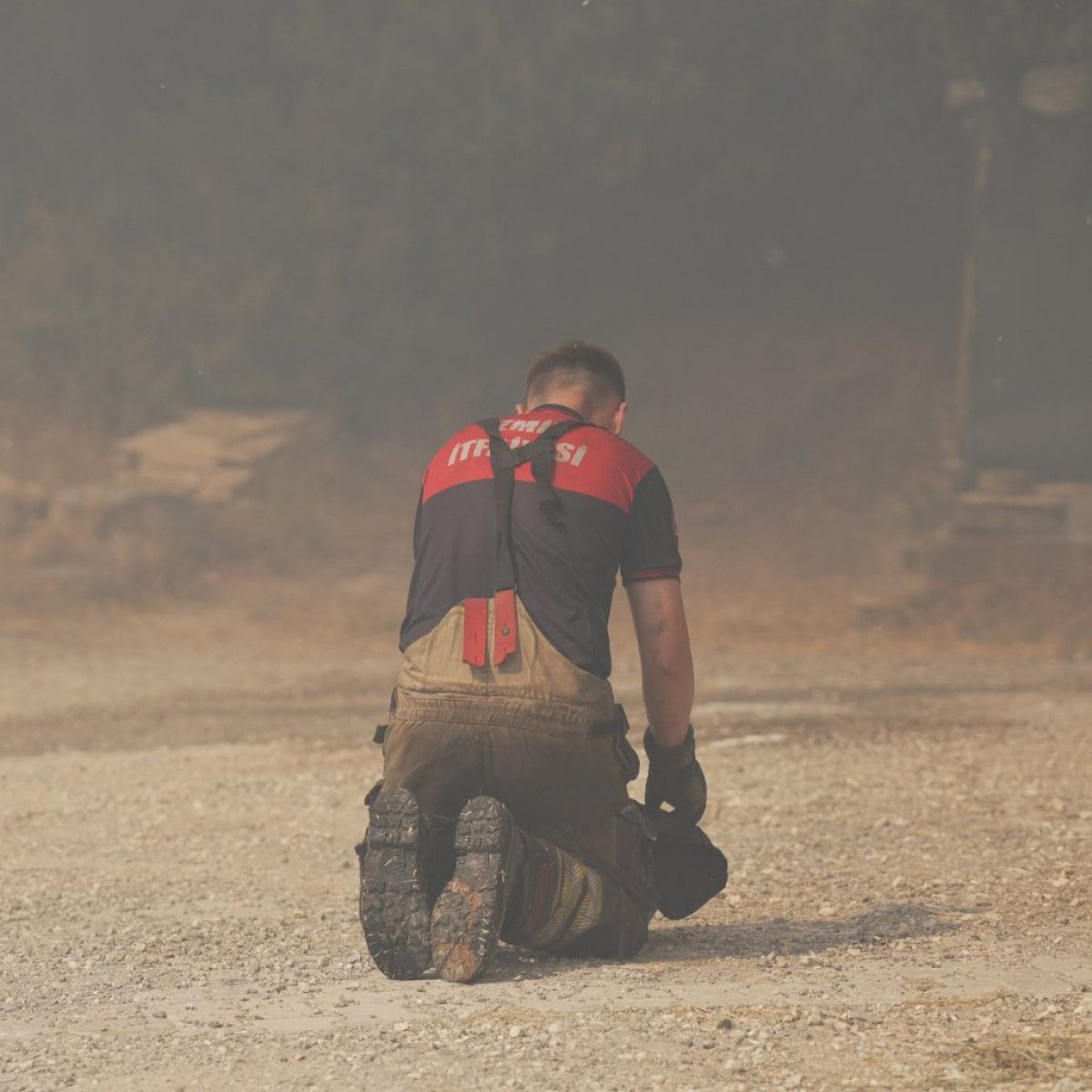 Yangını söndürmek için uğraşan ve bitkin düşen bir itfaiye eri ise bölgede yere çökmüş bir vaziyette görüntülendi.