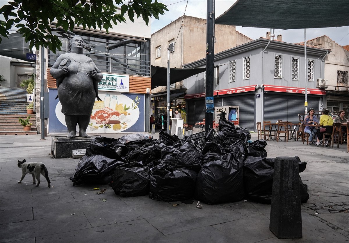 İzmir’in merkez Konak ilçesinde belediye işçilerinin greve gitmesi sonucunda çöp toplama hizmeti durdu.