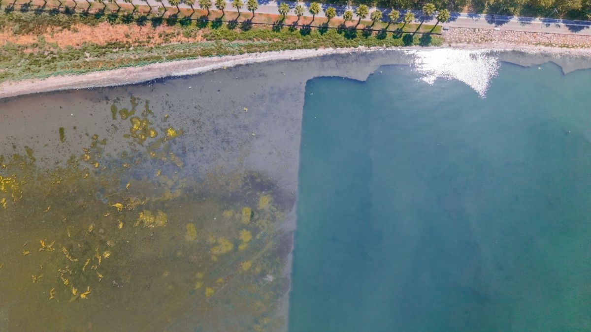 Büyükakın’ın paylaştığı fotoğrafta, dip çamurunun temizlendiği alanın mavi renge döndüğü, temizlenmeyen alanın ise gri ve kahverengi tonlarda kaldığı görüldü.