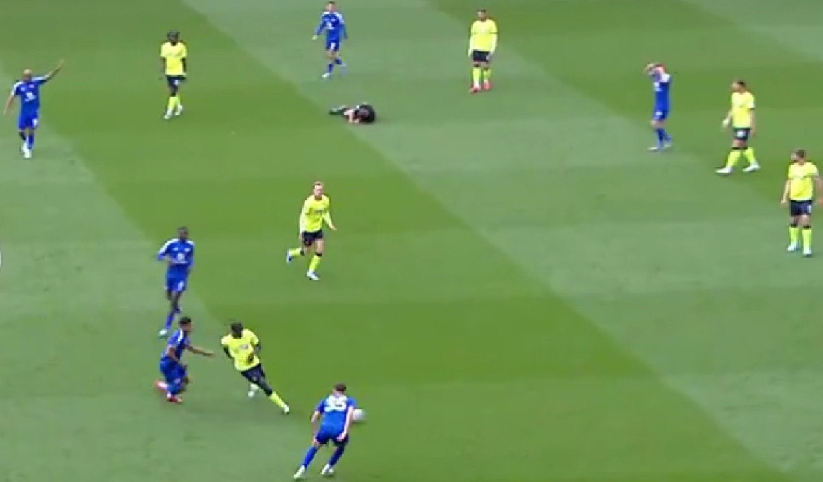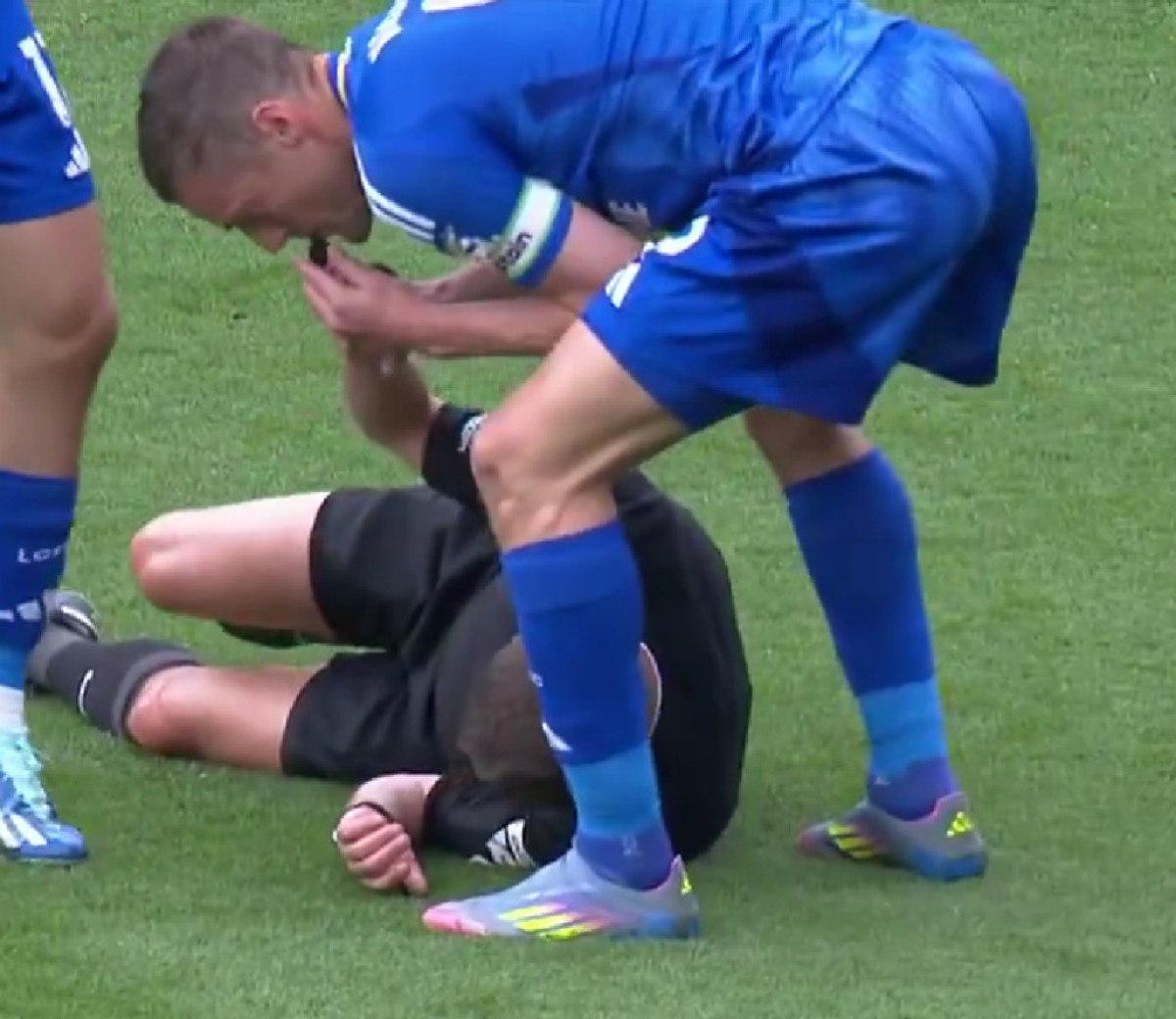 Maç önce devam ederken oyunun durmayacağını gören Vardy, hakemin yanına gelip düdüğünü aldı ve düdük çalarak maçı durdurdu.