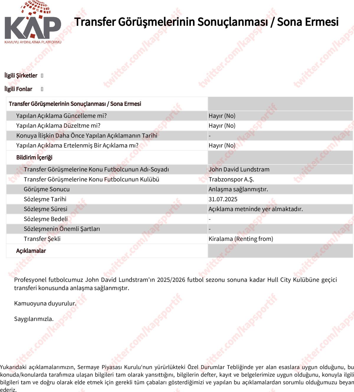 Trabzonspor’dan KAP’a yapılan açıklamada şöyle denildi: