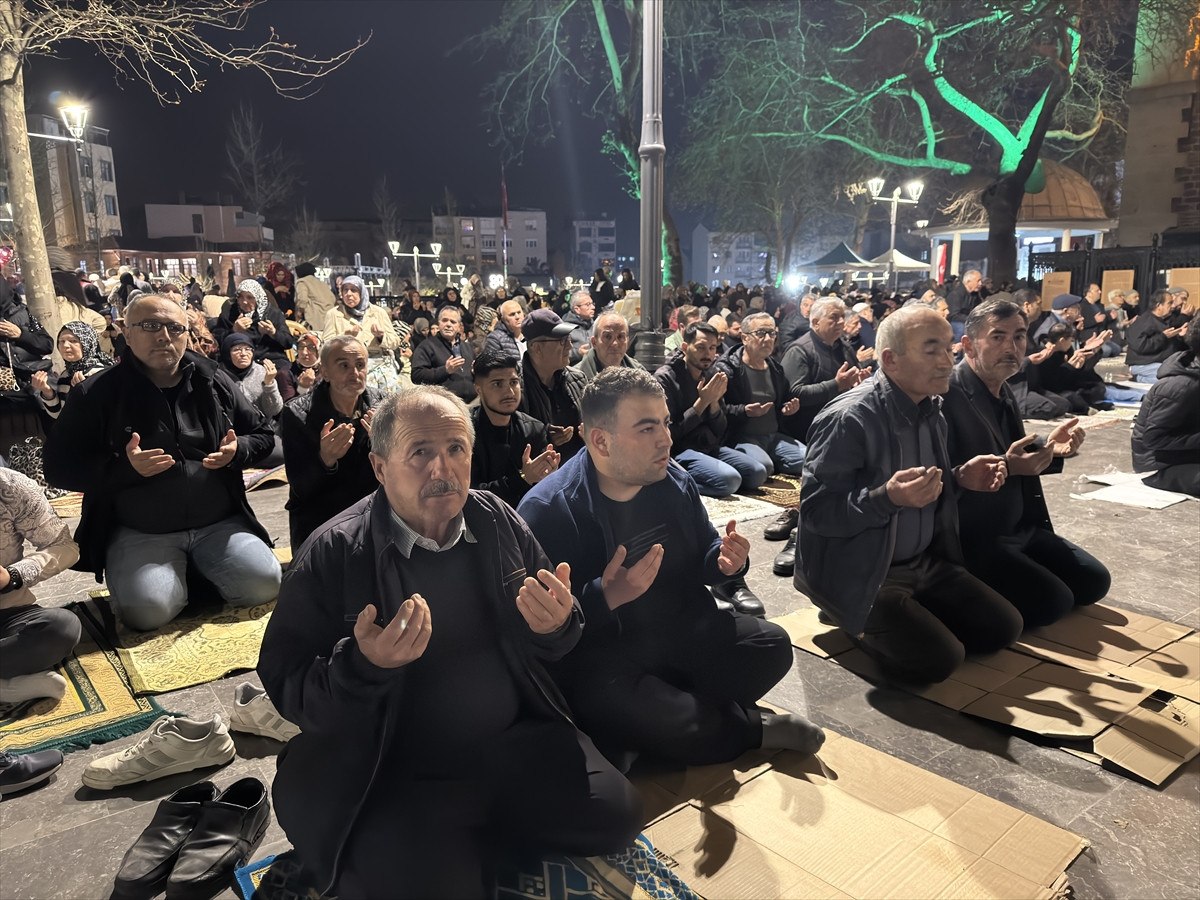 Yatsı ezanından sonra camileri dolduran vatandaşlar, Kur’an-ı Kerim okuyup dua etti. Camide yer bulmakta güçlük çeken vatandaşlar, avlulara serdiği seccadelerde namaz kıldı.