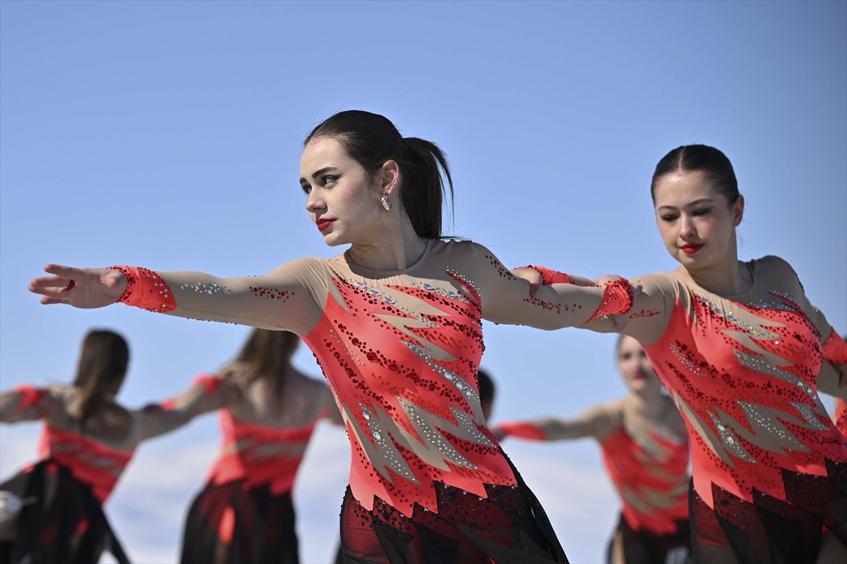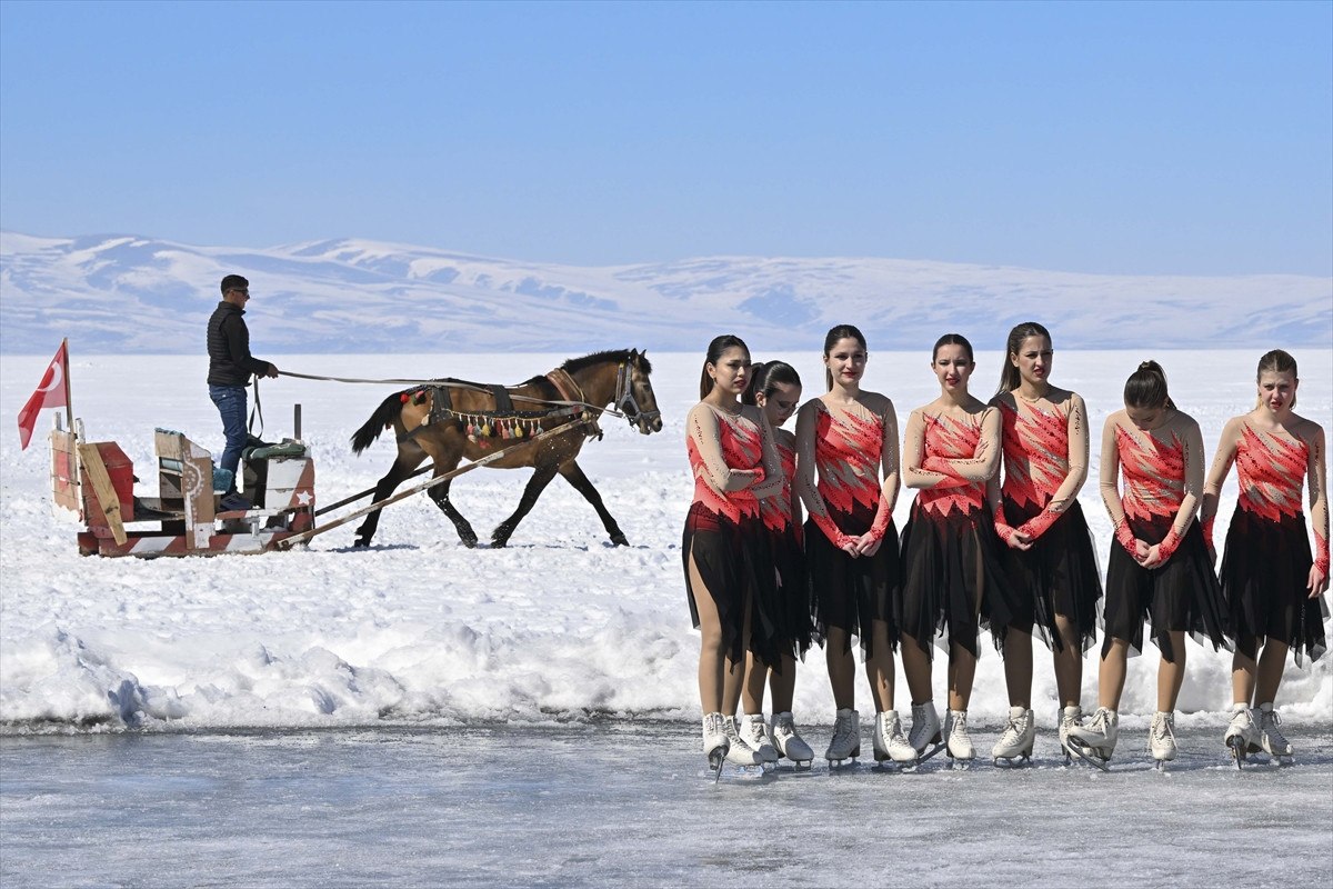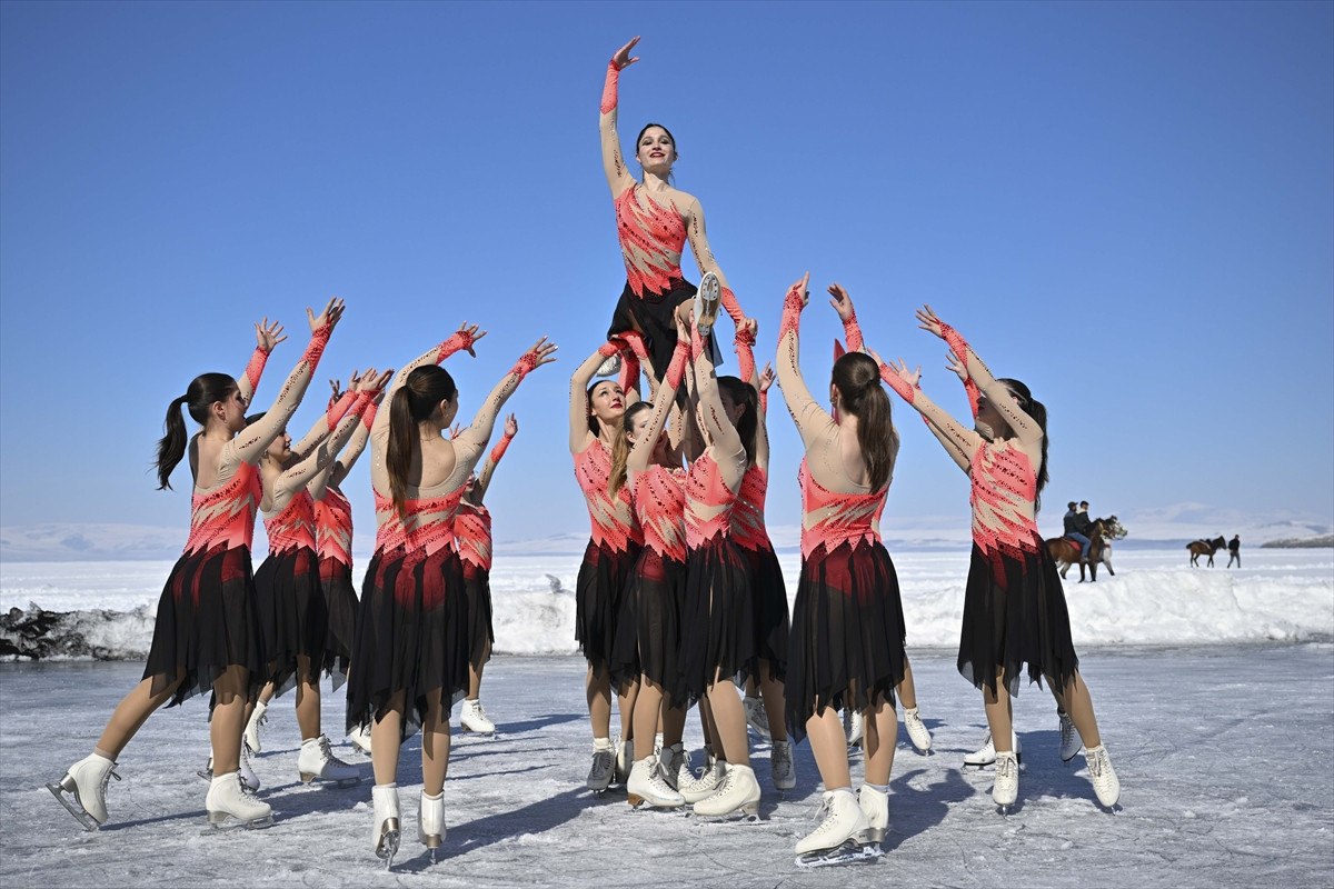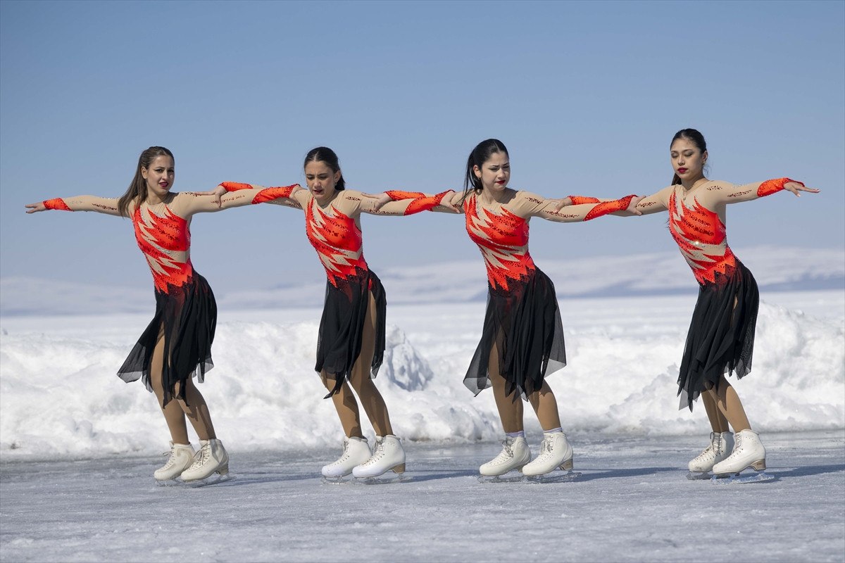 Daha sonra Senkronize Buz Pateni Kadın Milli Takımı, 8 Mart Dünya Kadınlar Günü kapsamında 123 kilometrekare alanı buzla kaplanan Çıldır Gölü’nde gösteri sundu.