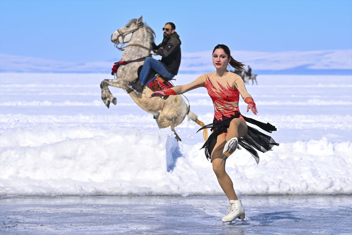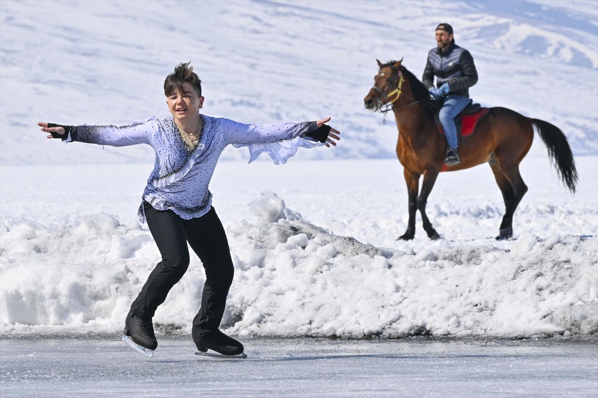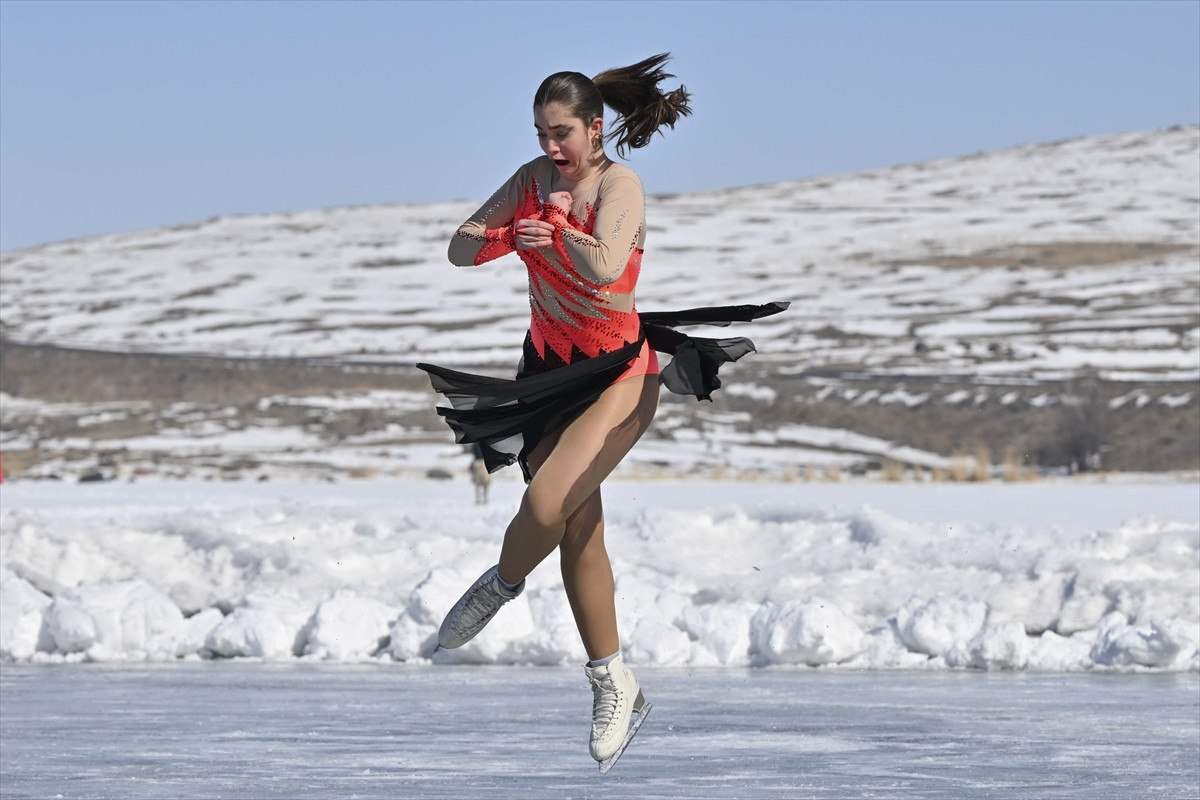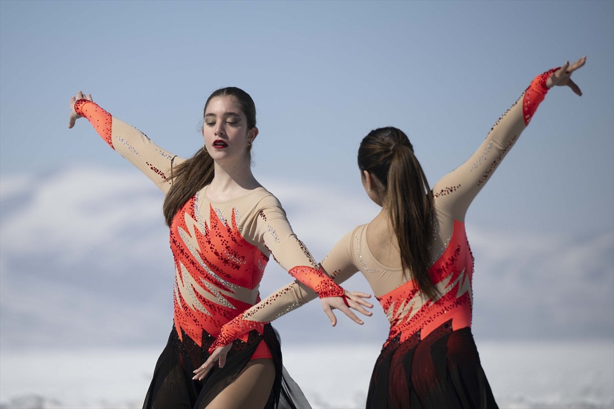 Daha sonra Senkronize Buz Pateni Kadın Milli Takımı, 8 Mart Dünya Kadınlar Günü kapsamında 123 kilometrekare alanı buzla kaplanan Çıldır Gölü’nde gösteri sundu.