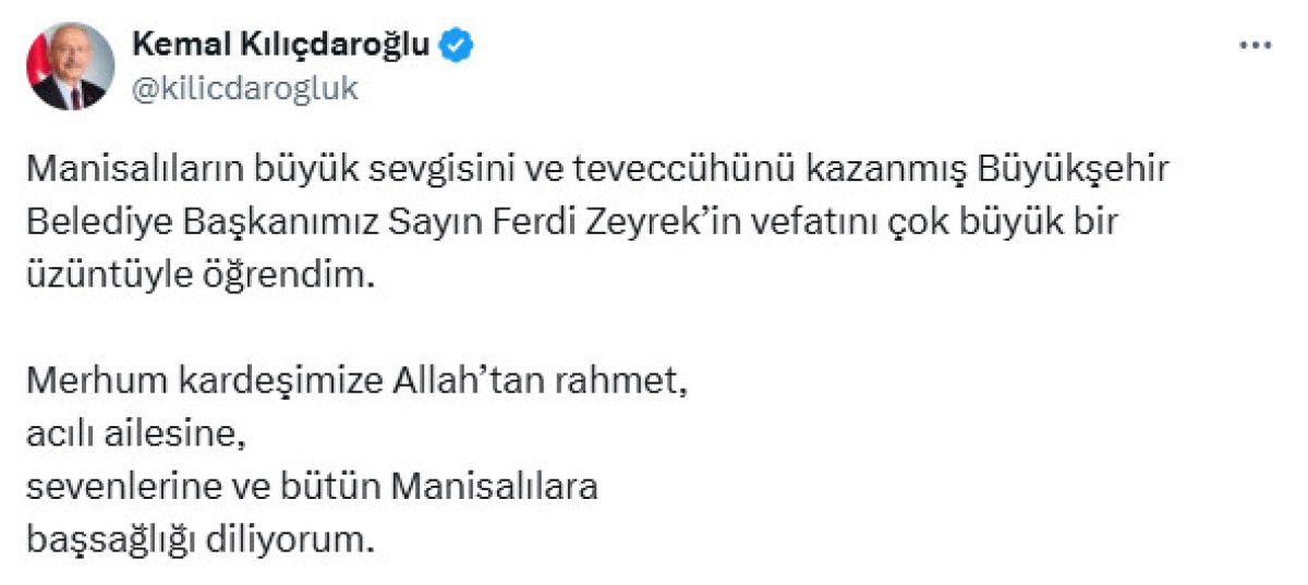 Zeyrek’in vefatı sonrası bir taziye mesajı da CHP’nin eski Genel Başkanı Kemal Kılıçdaroğlu’ndan geldi.